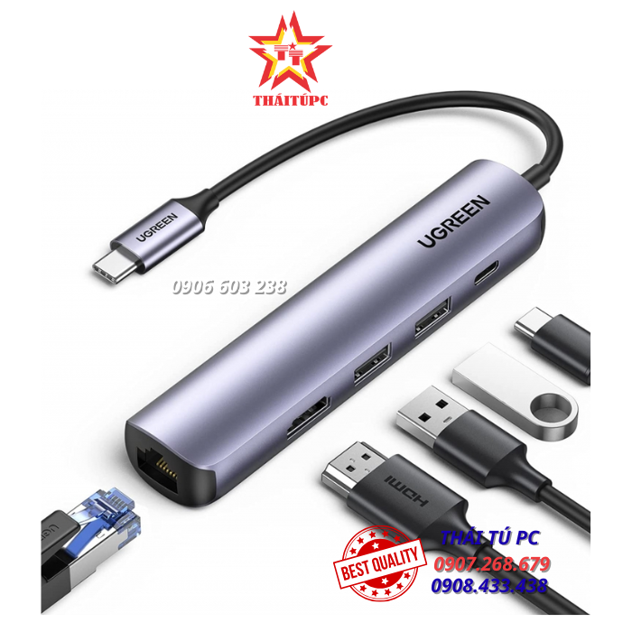 Bộ chuyển USB-C Ugreen 10919 HDMI 4K*2K + 2xUSB 3.0 + Lan 1Gbps + PD100W Cao cấp