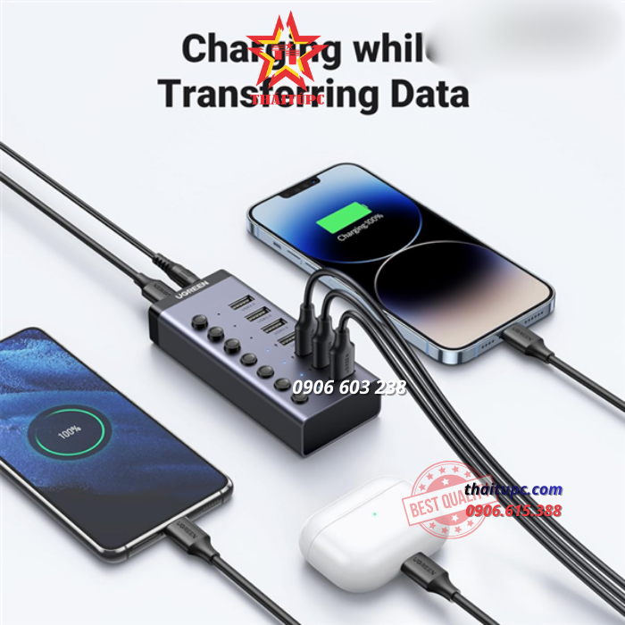 Bộ HUB chia 7 cổng USB 3.0 5Gbps vỏ nhôm, công tắc Ugreen 90307 (kèm nguồn 12V2A - chân tròn)