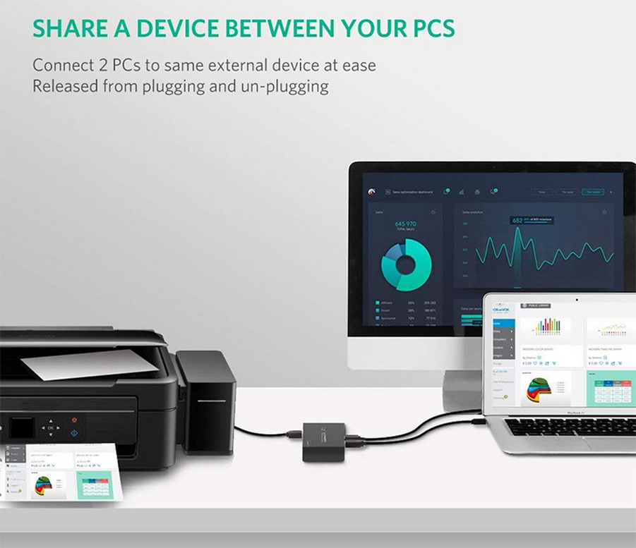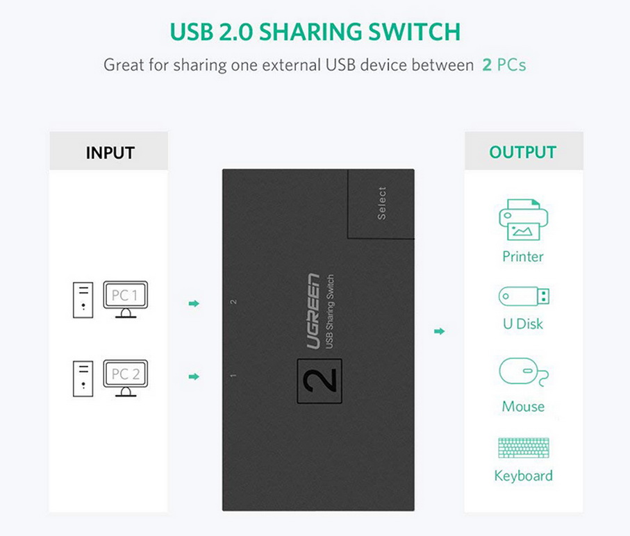 - Bộ Chia USB 2.0 cho 2 Máy Tính Ugreen 30345 là thiết bị lý tưởng dùng để chia sẻ thiết bị USB như máy in, USB, máy quét, ổ đĩa gắn ngoài hoắc các thiết bị ngoại vi USB khác với 4 máy tính (một máy tính có quyền truy cập tại một thời điểm), bạn có thể dễ dàng chuyển đổi giữa bốn máy tính này chỉ với một phím bấm.