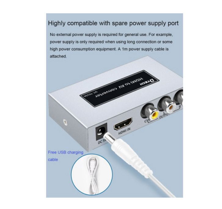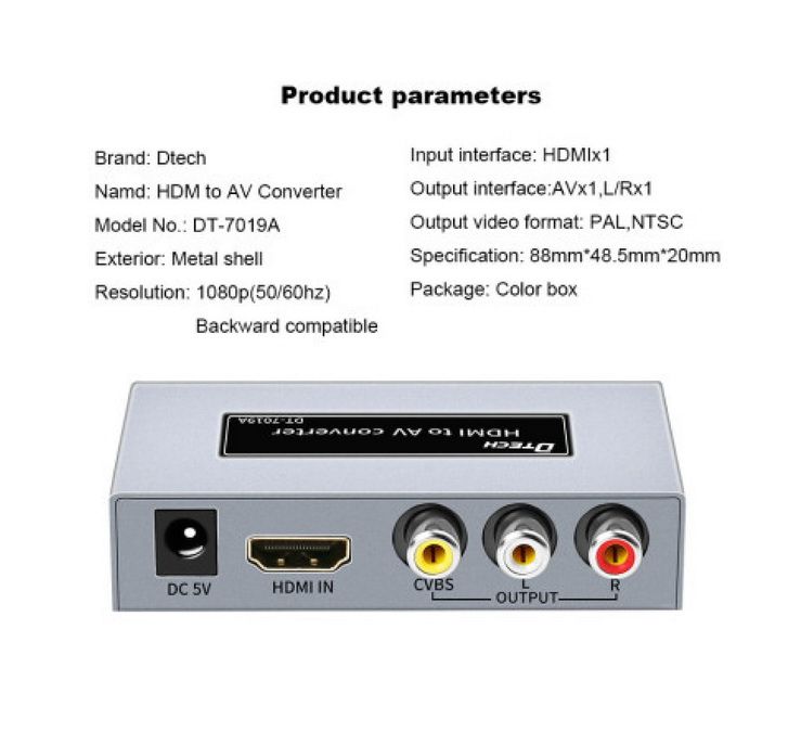 HDMI sang AV DTECH DT-7019A là bộ chuyển đổi tín hiệu cho phép bạn kết nối một thiết bị có đầu ra HDMI như đầu đĩa Blu-ray, bộ giải mã truyền hình kỹ thuật số, laptop, pc, đầu ghi … với thiết bị có đầu vào AV như TV, loa hoặc một bộ khuếch đại