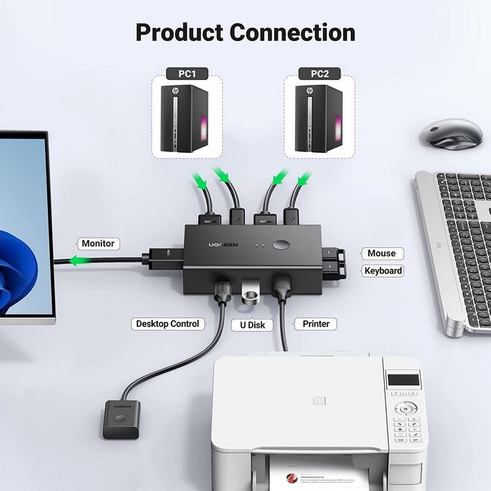 Bộ chuyển tín hiệu 2 CPU dùng 1 màn hình KVM Switch HDMI, USB 4K@60Hz Ugreen 15166 cao cấp Bộ gộp tín hiệu KVM HDMI Ugreen 15166 này giúp bạn sử dụng một bộ bàn phím, chuột và máy in để tập trung điều khiển hai máy tính của mình trên một màn hình, giúp tối đa hóa năng suất và khả năng xem, đồng thời cải thiện nhận thức tình huống bằng cách cho phép thu thập nhanh dữ liệu từ nhiều máy tính cùng một lúc. Các kịch bản ứng dụng bao gồm thay thế máy tính để bàn trong văn phòng, hình ảnh y tế, phát sóng, hậu sản xuất, phòng điều khiển và kiểm soát, v.v.