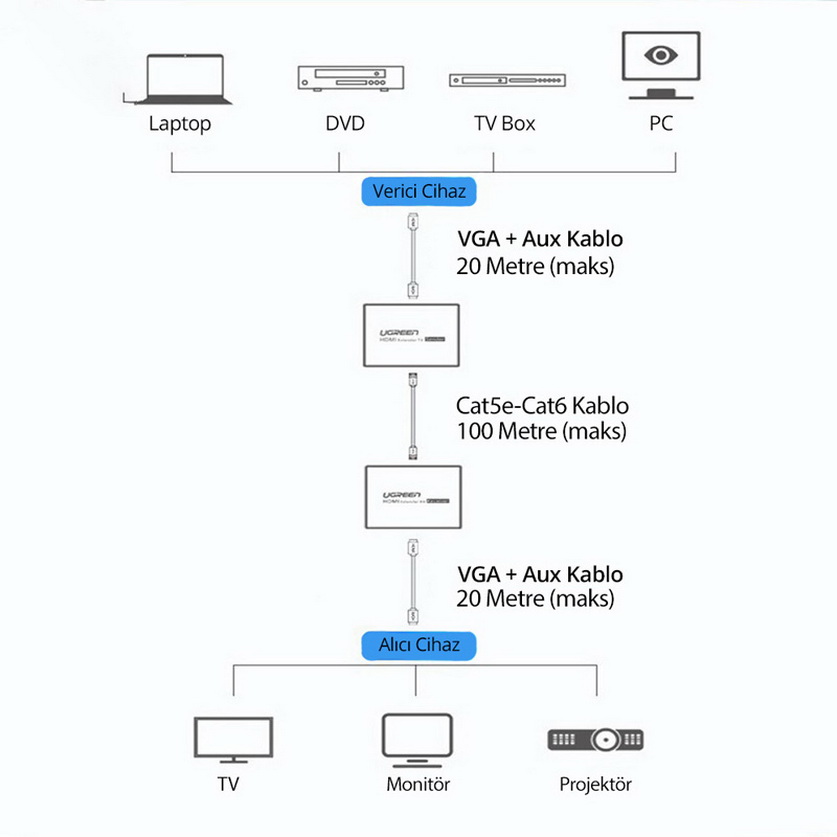 Bộ kéo dài VGA thông qua cáp mạng CAT5E,CAT6 100-140M + Audio Ugreen 60533 ( 1 Bộ 2 Cục )