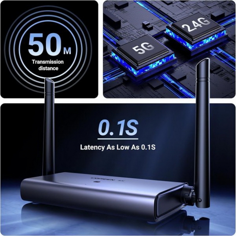 - Truyền không dây đường dài: Nhờ chip 5G mạnh mẽ và thiết kế ăng-ten kép, khoảng cách truyền tối đa của bộ truyền HDMI không dây Ugreen 90909A có thể đạt tới 50M. Ngay cả khi môi trường tín hiệu tương đối phức tạp, vẫn có thể đạt được đường truyền ổn định. Thiết bị cực kỳ dễ dàng sử dụng khi chỉ cần cắm là nhận không cần cài đặt driver, kết nối chỉ với 1 phím bấm.
