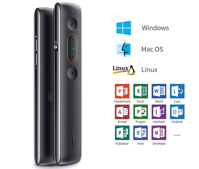 - Đèn Laser, Lật trang lên xuống, Chuyển đổi Windows, Tăng giảm âm lượng, Mở và đóng màn hình