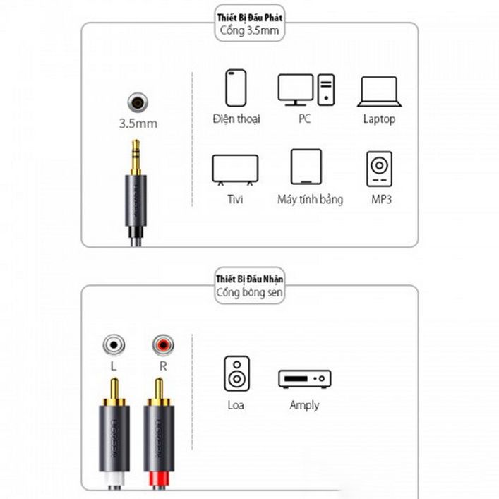 1.Cáp Audio 3.5mm to AV 2 RCA cao cấp chính hãng Ugreen là sợi cáp chuyên dùng để kết nối điện thoại, laptop, máy nghe nhạc... cổng 3.5mm của bạn với loa, amply cổng Audio RCA (giắc 2 bông sen L/R).