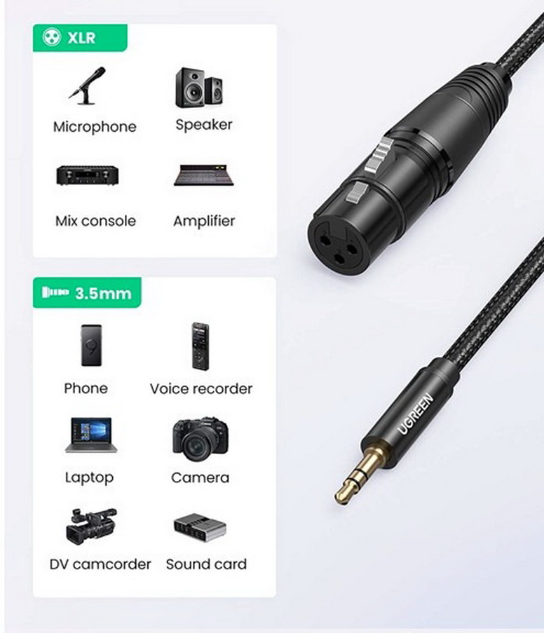 - Kết nối dễ dàng: Với cáp Audio 3.5mm sang AV Canon (XLR) âm dài 1m Ugreen 20763, điện thoại di động, laptop có thể kết nối với micro một cách nhanh chóng, dễ dàng hơn.