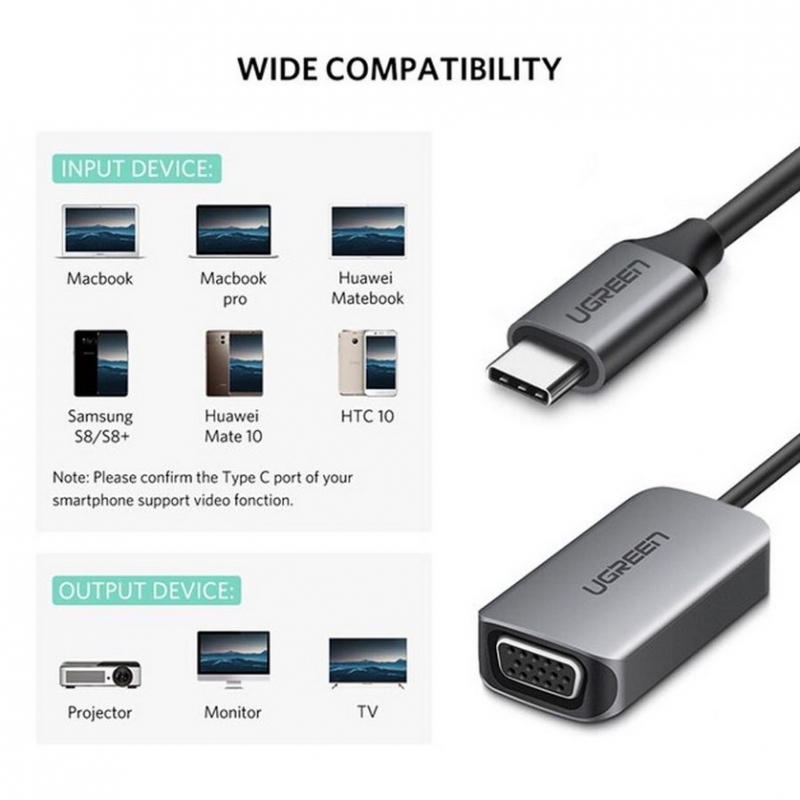 Cáp chuyển đổi USB Type-C sang VGA của Ugreen 50316 được thiết kế để kết nối các máy tính mới được phát hành như MacBook 2015, Google Chromebook Pixel hoặc ASUS Zen AiO PC với HDTV, màn hình hiển thị hoặc máy chiếu có giao diện VGA ở độ phân giải lên đến 1080P, xuất ra nội dung do người dùng tạo như thuyết trình và tài liệu công việc, nó cũng có thể hoạt động để tăng năng suất của bạn bằng cách mở rộng máy tính để bàn của bạn lên màn hình phụ, nhân đôi không gian làm việc có sẵn.