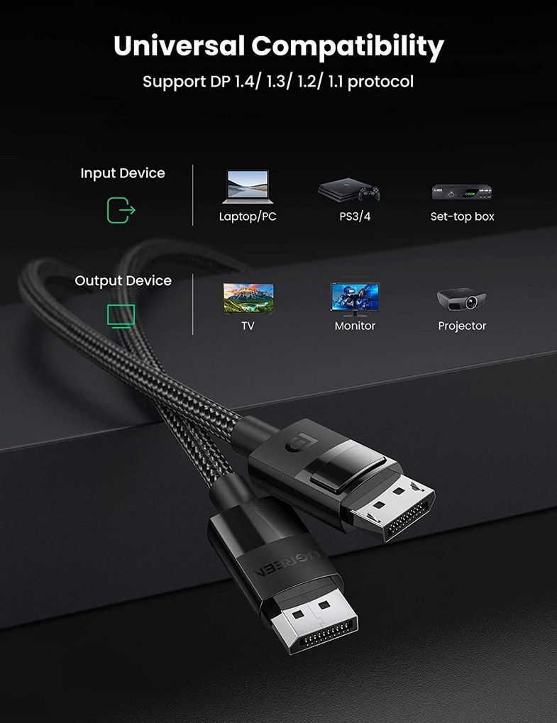 2. Trải nghiệm âm thanh & hình ảnh hoàn hảo: Cáp DP này hỗ trợ truyền âm thanh 32Bit / 1536KHz, bạn có thể nghe rõ tất cả âm thanh khi chơi game. Không chỉ hỗ trợ 8K @ 60Hz, 4K @ 144Hz, 2K @ 165Hz, còn có sẵn cho 3D, Dynamic HDR, Display Stream Compression phiên bản 1.2 (DSC), Forward Error Correction (FEC), G-sync, hiển thị nhiều chi tiết hơn và chân thực trong hình ảnh .