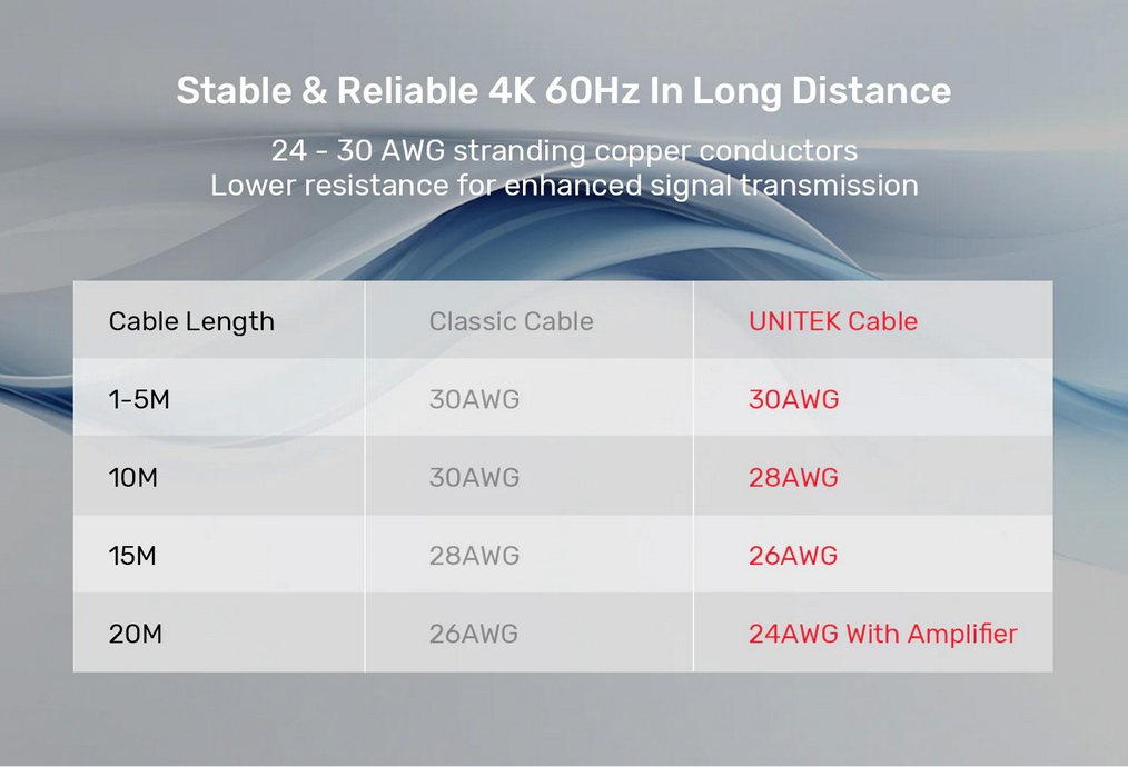 Cáp UNITEK HDMI 2.0 sử dụng dây dẫn đồng từ 30AWG đến 24 AWG để đảm bảo truyền tín hiệu ổn định và đáng tin cậy.