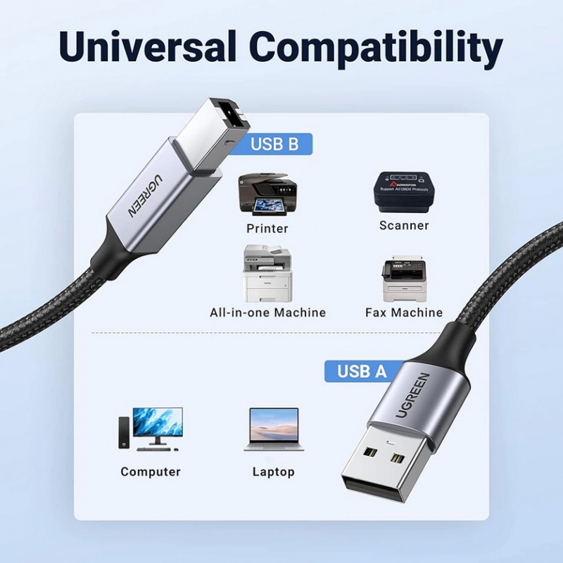 - Cáp máy in USB A sang USB B Ugreen US369 Giải pháp kết nối hoàn hảo cho máy in và máy quét hỗ trợ cổng USB B như: máy Fax , piano kỹ thuật số , máy in đa chức năng như Epson, HP DeskJet / Envy, Lexmark, Dell, Brother, 3D… đến máy tính xách tay, PC hoặc bất kỳ thiết bị hỗ trợ cổng USB A nào.