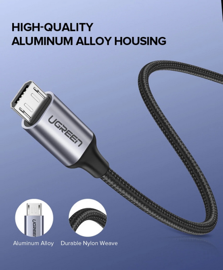CÁP SẠC MICRO USB 2.0 DÀI 2M BỌC DÙ SẠC 2.4A QC3.0 UGREEN 60148 SẠC NHANH CAO CẤP