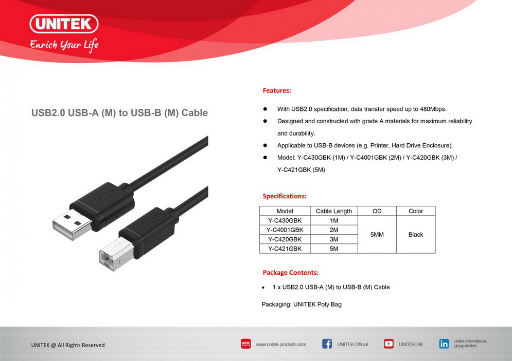 CÁP USB IN 2.0 - 3M UNITEK (Y-C 420GBK)