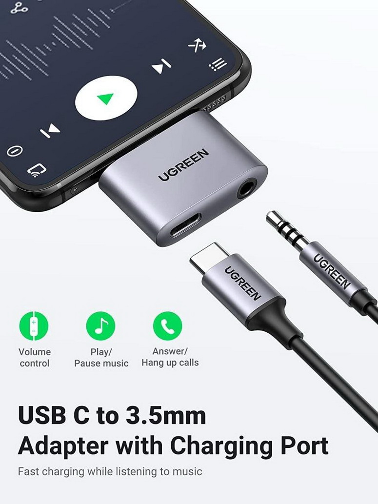 Đầu chuyển USB Type C Ugreen 70311 hỗ trợ kết nối âm thanh + sạc cổng USB C cho điện thoại di động, máy tính bảng cho phép bạn nghe nhạc trong khi sạc, không phải lo lắng về điện thoại hết pin. Bộ chuyển đổi USB Type C hỗ trợ chức năng micro và điều khiển âm lượng +/- và chuyển bài hát tiếp theo hoặc trước đó.