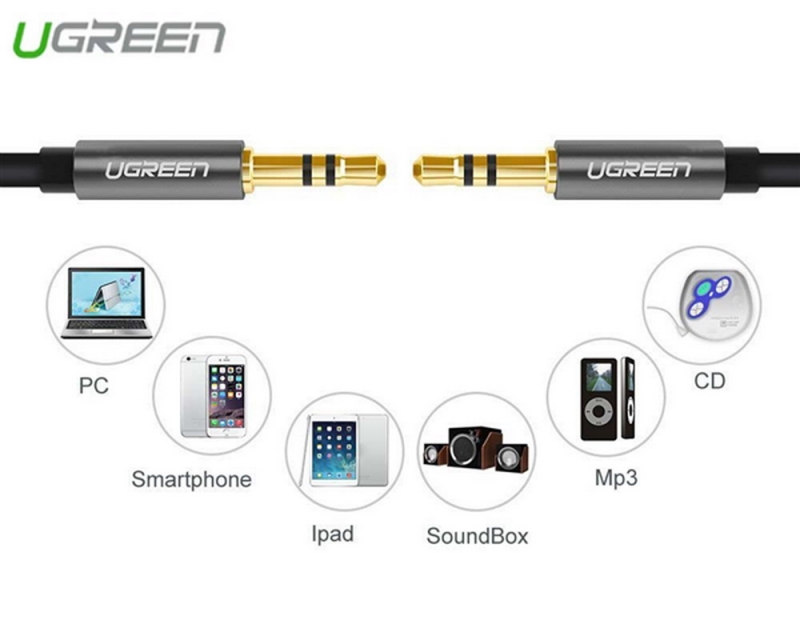 Dây loa Aux hai đầu 3,5mm dài 2m Ugreen 10735 cho phép bạn kết nối các thiết bị di động như Iphone, Ipod, máy nghe nhạc, Laptop … chuẩn 3,5mm đến hệ thống loa cổng Aux 3,5mm như loa trên xe ô tô, loa máy tính, dàn âm thanh…