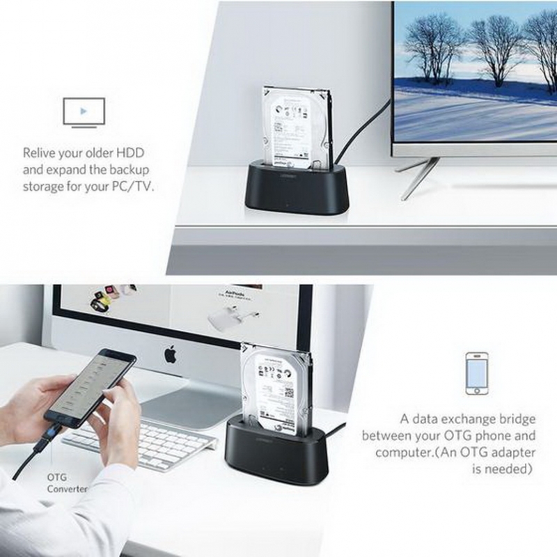 - - Ổ cắm USB sang SATA III có thể chứa cả HDD / SSD 2,5 "và 3,5" SATA I / II / III. Hỗ trợ dung lượng lên đến 12TB và độ dày từ 7mm đến 26mm, như WD Blue SATA III HDD 3.5 / 2.5, Seagate Barracuda Internal HDD 3.5, Seagate IronWolf, Toshiba P300, Samsung 860 EVO SATA SSD, Crucial MX500 SSD 2.5, TOSHIBA TR200, PNY CS900 SSD, Crucial BX500, SSD Kingston A400, SSD Integral V Series, DREVO X1, ADATA ASU650, Ổ cứng thể rắn nội bộ YUCUN / Gigabyte