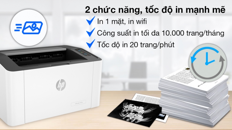 Thiết lập cho máy in HP công suất in tối đa 10.000 trang/tháng, in trang đầu tiên trong 8.3 giây cùng chức năng in 1 mặt, in wifi linh hoạt, giúp bạn chuẩn bị tài liệu cho công việc nhanh nhẹn, đáp ứng nhu cầu sử dụng tối đa.