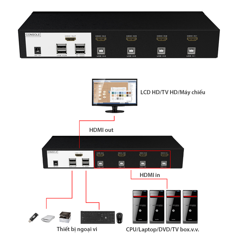 Đây là thiết bị điều khiển 4 máy tính cổng HDMI từ 1 màn hình và 1 bộ bàn phím chuột duy nhất. Hiển thị màn hình báo tình trạng hoạt động.Đat độ phân giải cao 1920x 1080P, hỗ trợ 2k*4k@30Hz. Được dùng chủ yếu trong lĩnh vực chứng khoán