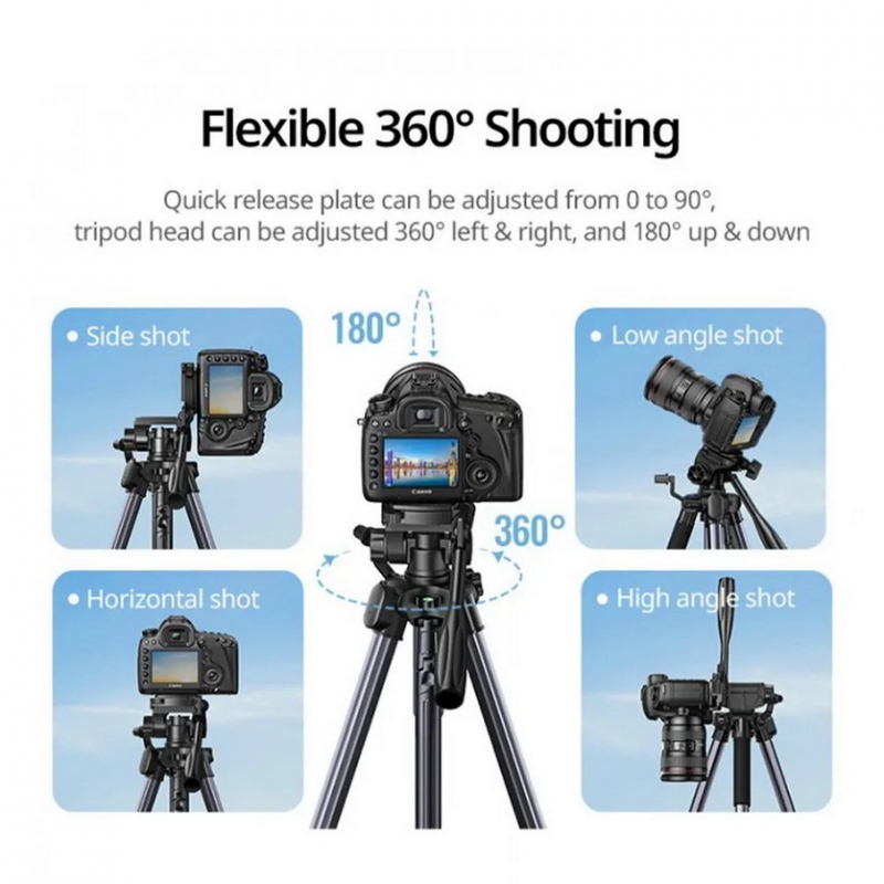 - Dễ dàng di chuyển: Thiết kế gọn nhẹ chỉ với 1.2Kg và có thể gấp gọn lại còn 55cm, giúp bạn mang theo sản phẩm một cách thuận tiện mọi lúc mọi nơi. Điều chỉnh độ cao miễn phí Chân máy ảnh có 3 phần chân nên bạn có thể điều chỉnh độ cao của chân máy cho các tình huống khác nhau. Chiều cao có thể được mở rộng từ 53,5cm đến 175cm. Cột trung tâm có thể điều chỉnh độ cao tối đa 31,5 cm.